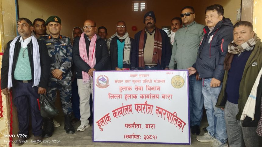 बारा माघ ११ ।बारा जिल्लाको पचरौता नगरपालिका–७ मा शुक्रबार हुलाक सेवा कार्यालयको उद्घाटन गरिएको छ। नेपाल सरकारको “एक पालिका, एक हुलाक कार्यालय” नीति अन्तर्गत पचरौता नगरपालिकामा कार्यालय स्थापना गरिएको हो।