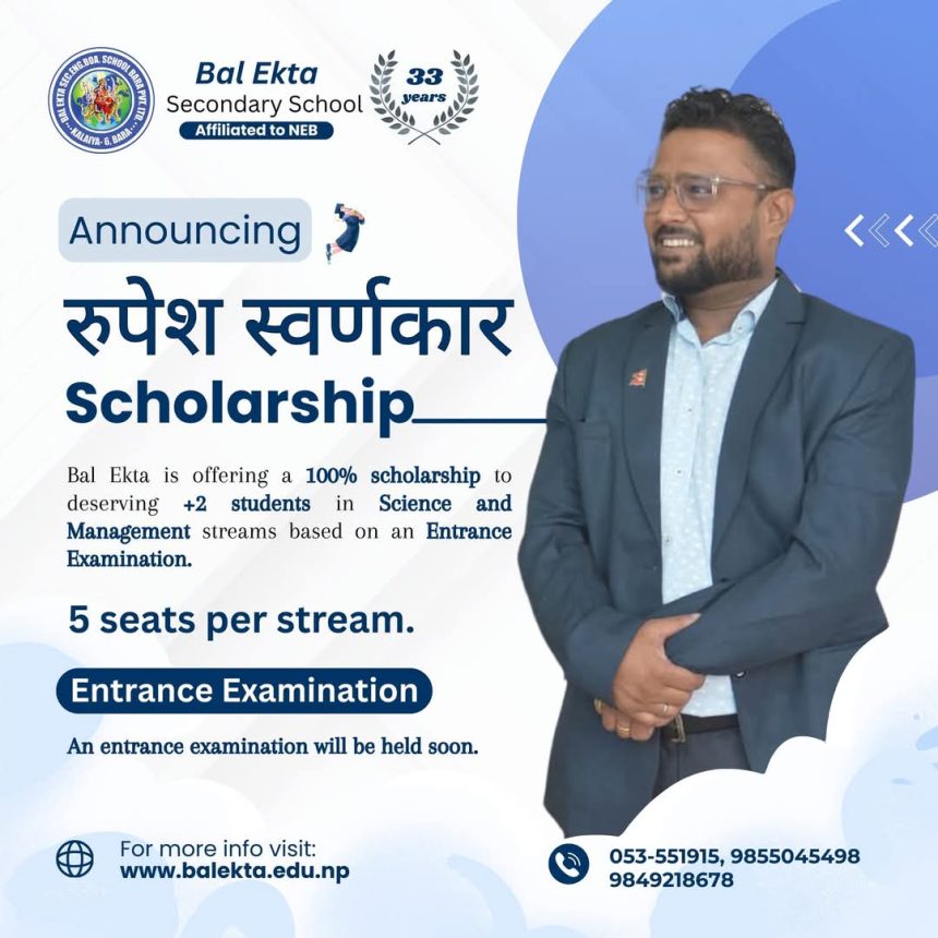 कलैया, ०८ जेठ — बाल एकता सेकेन्डरी ईङ्ग्लिस बोर्डिङ स्कुल +२ विज्ञान तथा म्यानेजमेन्ट कलेजले पूर्वप्रधानाध्यापक स्व. रुपेश स्वर्णकारको स्मृतिमा “रुपेश स्वर्णकार छात्रवृत्ति” स्थापना गर्ने भएको छ। विद्यालयले स्वर्णकारको दोस्रो पुण्यतिथिको अवसरमा यो छात्रवृत्तिको घोषणा गरेको हो।