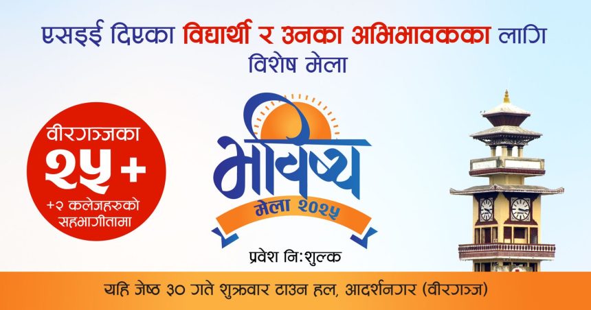 पर्सा, – जेठ – २५ ।अञ्जली गुप्ता – बारा, रौतहट र आसपासका क्षेत्रका माध्यमिक शिक्षा परीक्षा (एसइई) को परीक्षा दिएका विद्यार्थी र तिनका परिवारलाई लक्षित गरी वीरगञ्जमा ‘भविष्य मेला २०२५’ को आयोजना हुने भएको छ ।