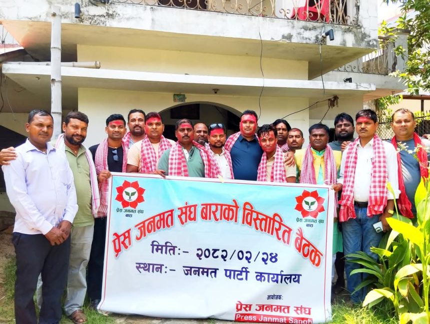 बारा जेठ –२५। जनमत पार्टीको भातृसंगठन प्रेस जनमत संघ बाराले नयाँ ११ सदस्यीय जिल्ला समिति गठन गरेको छ। संगठनको विस्तारित बैठक शुक्रबार बाराको कलैयामा सम्पन्न भयो, जसमा अनिल पाण्डेको अध्यक्षतामा नयाँ कार्यसमिति चयन गरिएको हो।