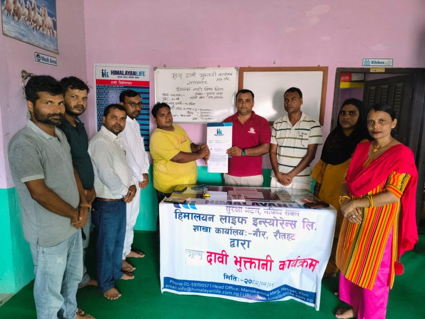 उक्त अप्रत्याशित घटनापछि बीमा कम्पनीले बिमालेख बमोजिमको दाबी रकम १५ लाख ९२ हजार रुपैयाँ गौरस्थित शाखा कार्यालयमार्फत मृतकका परिवारलाई प्रदान गरेको हो। रकम हस्तान्तरणको कार्यक्रम हिमालयन लाइफ इन्स्योरेन्सका गौर शाखा प्रमुख राहुल ठाकुरको उपस्थितिमा सम्पन्न भएको थियो।