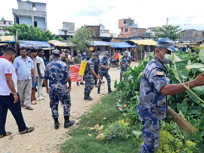 बारा – भादौ – ०६ सिम्रौनगढ, बाराको सिम्रौनगढ नगरपालिकामा लामखुट्टेबाट फैलिने डेंगु, मलेरिया लगायतका रोगहरू नियन्त्रण गर्न सशस्त्र प्रहरी बल, गुल्म गाेलागञ्जका सशस्त्र प्रहरी निरीक्षक ईश्वर कार्की र इलाका प्रहरी सिम्रौनगढ नगर प्रहरी प्रमुख रबिन्द्र प्रसाद यादवको सहकार्यमा विशेष सरसफाइ तथा कीटनाशक छर्कने अभियान सञ्चालन गरिएको छ।