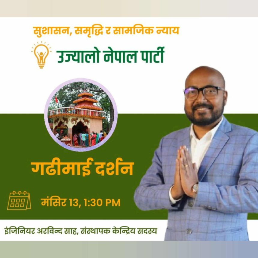 बारा – मंसिर १३ ।मधेश प्रदेशको बारा जिल्ला क्षेत्र नं–२, महागढीमाई नगरपालिका–७ तेलकुवा निवासी इञ्जिनियर अरविन्द साह, जो उज्यालो नेपालका संस्थापक केन्द्रीय सदस्य पनि हुन्, आज मिति २०८२ मंसिर १३ गते गढीमाई मन्दिर दर्शनका लागि आउँदै हुनु भएको छ। उहाँ आज दिउँसो ठिक १:३० बजे गढीमाई पुग्ने कार्यक्रम रहेको छ।